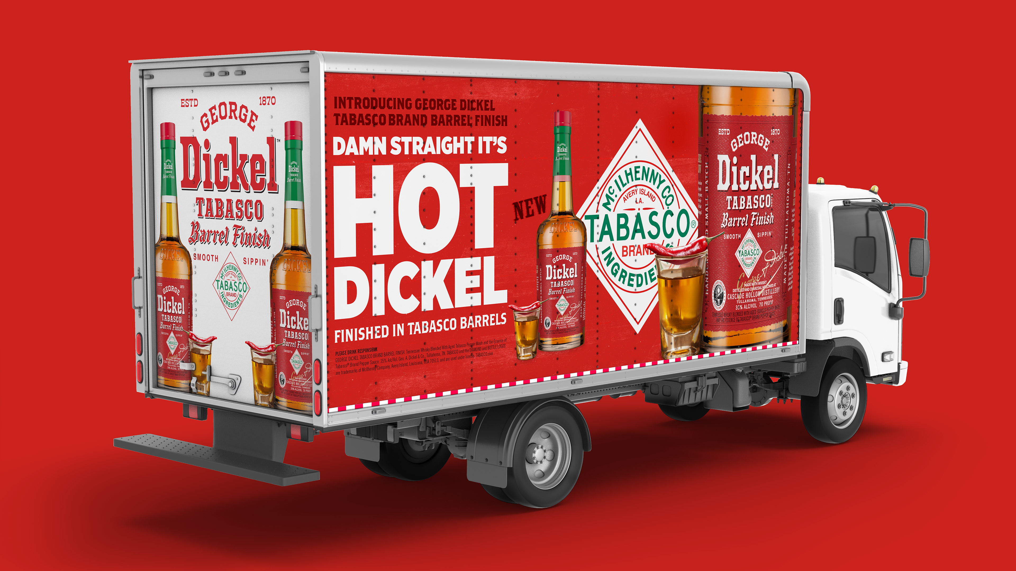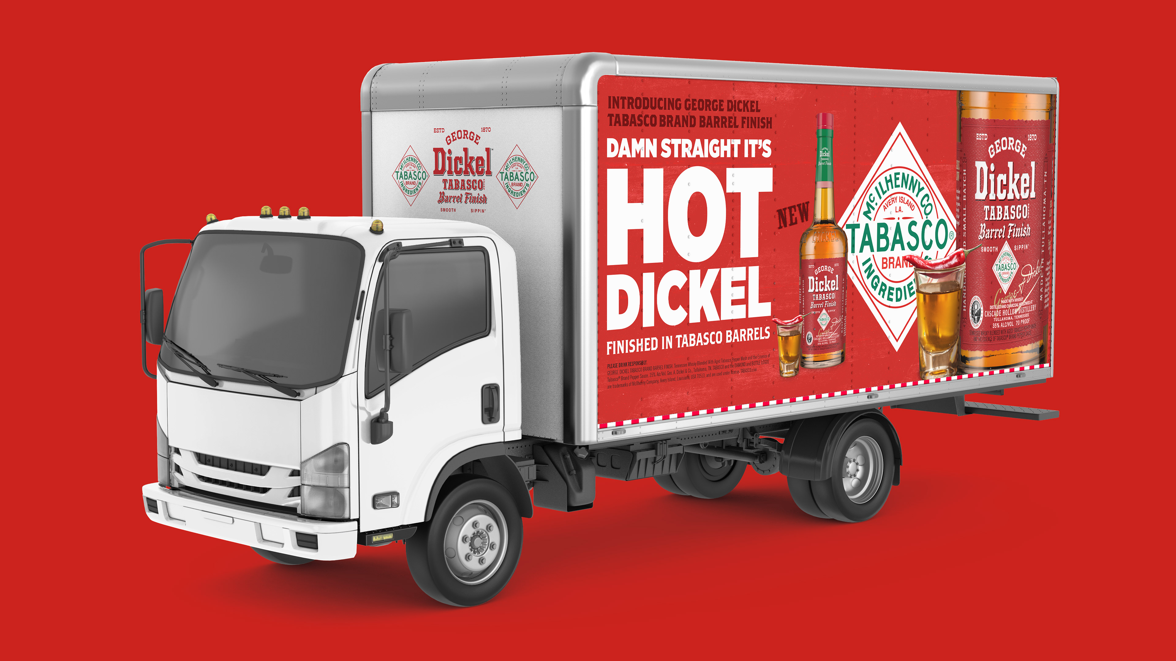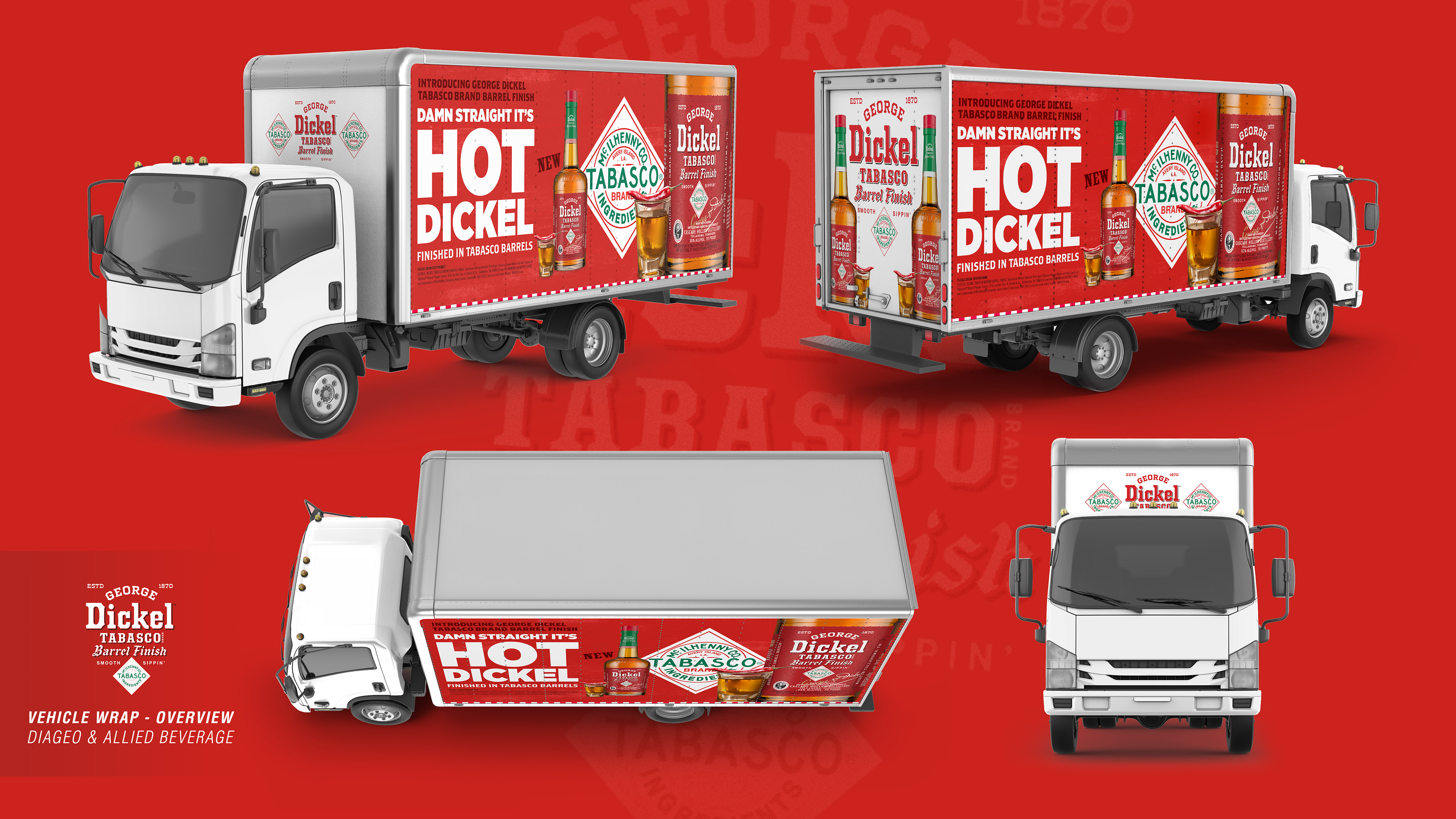 Box truck production artwork for George Dickel Tabasco Barrel Finish. Client was DIAGEO in conjunction with Allied Beverage Group (spirits distributor) - all photography and brand assets were provided by DIAGEO brand team - I handled the graphic layouts and all production artwork for the vehicle wrap. Print-ready files were provided to client to be outsourced to printer / vinyl installer.