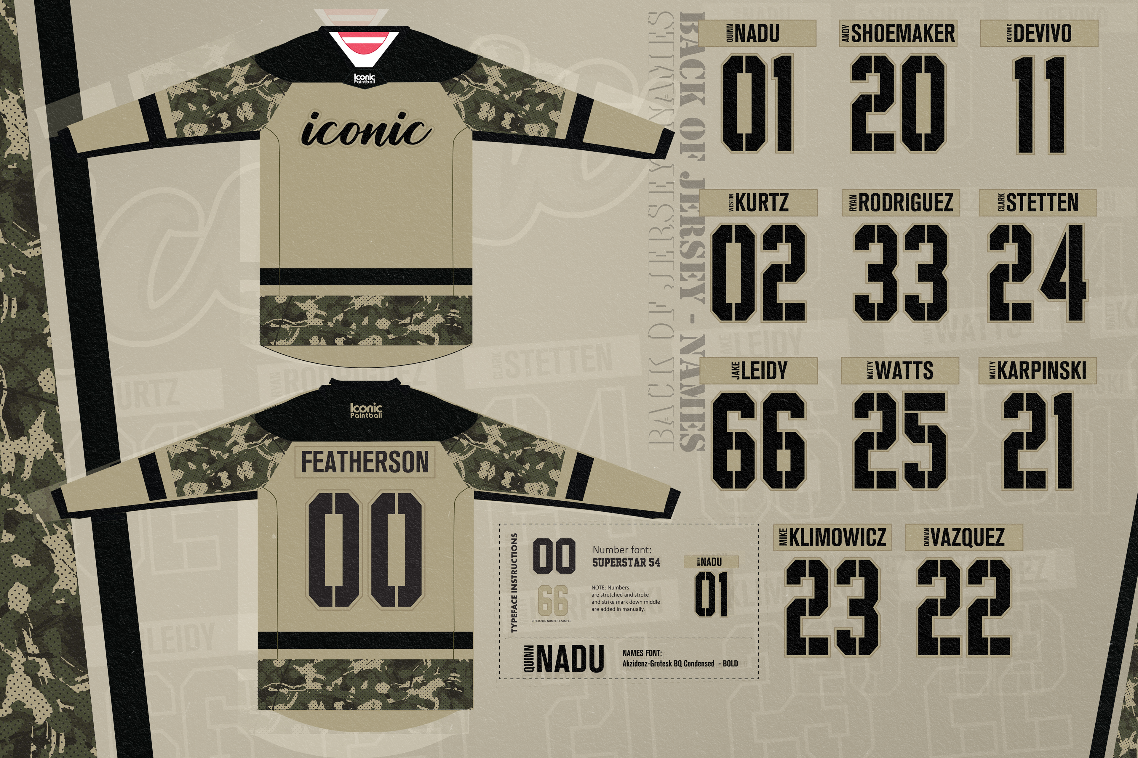 Design and production artwork created for the ICPL Professional Paintball team - Philadelphia Iconic. Design was heavily inspired by NHL hockey jersey layouts, names and numbers for back of jerseys were a typeface that I custom modified to mimic embroidered lettering.