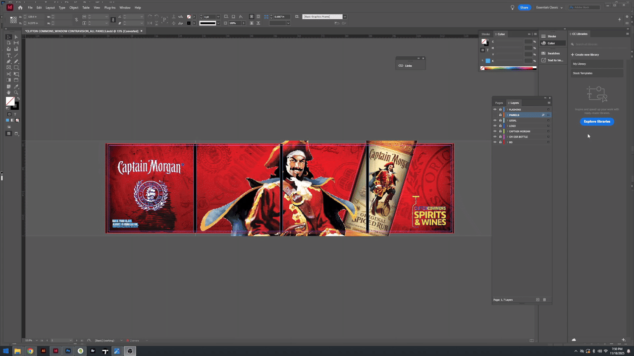 Captain Morgan - Window Mural for Clifton Commons. Black bars on image indicate where the flashing / cladding of window glass will be. Background image was a composite of Captain Morgan imagery, combined for a higher contrast / more dramatic background.