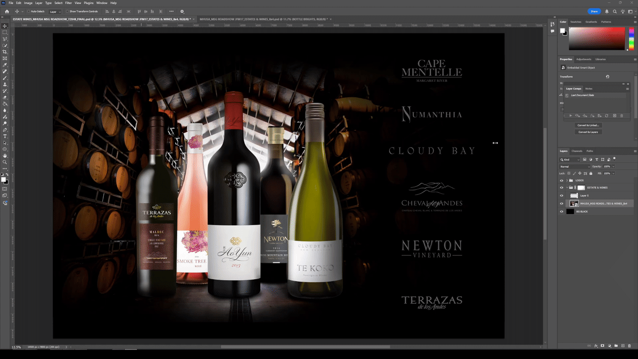 Moet Hennessy - Estate Wines - Image Comp. This image was put together for trade show signage, was also adapted to endcap signage at stores, video signage etc. Once the visual was set, bottle can be swapped in and matched with lighting for more variety in usage.