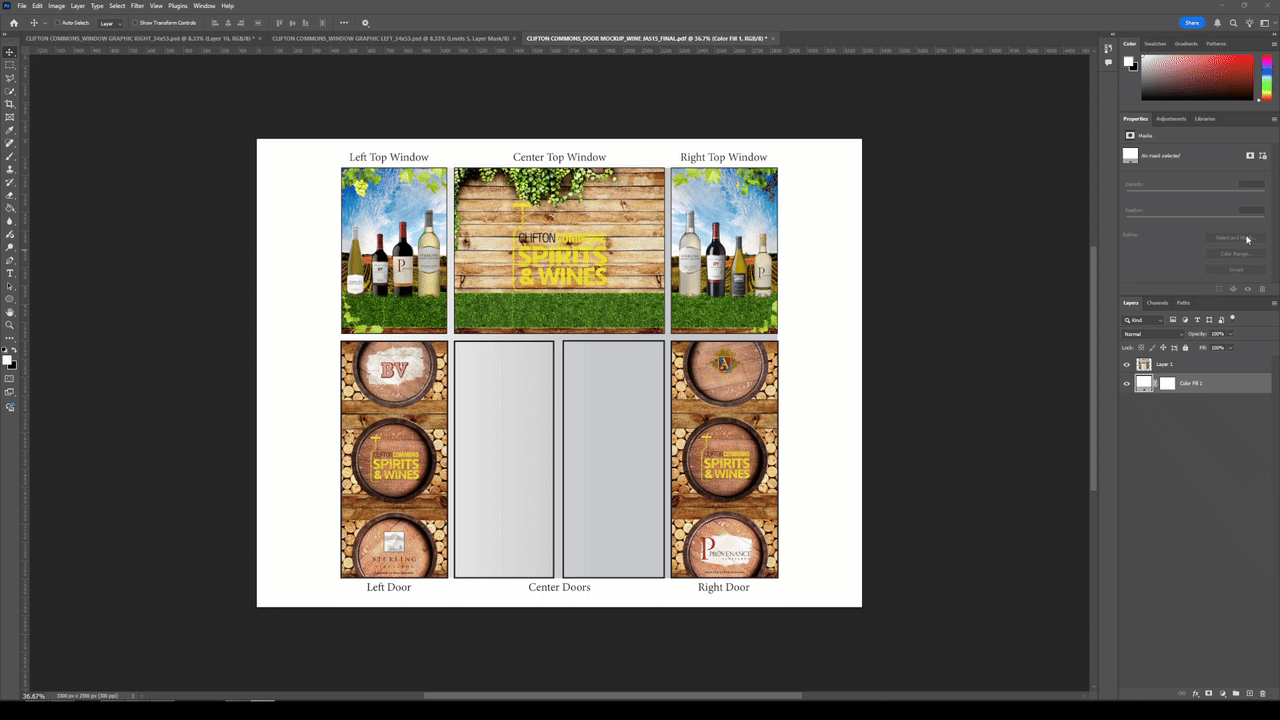 Clifton Commons - Entrance Window Mural. Each window was it's own unique image composite, tied together elements from a variety of brands and matched lighting to work across all images.