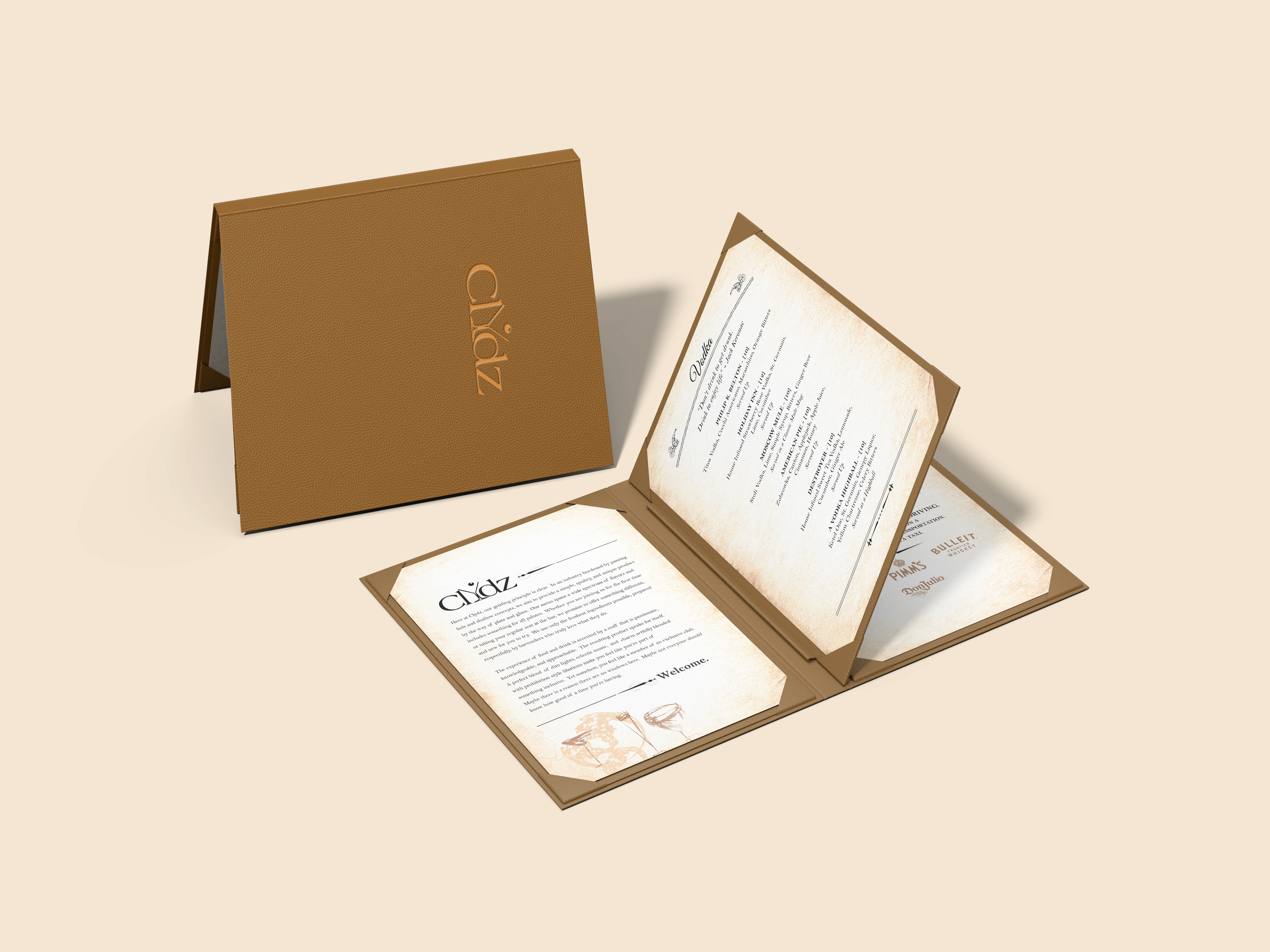 Clydz Cocktail Bar - Custom Menu Book ( Leather bound w/ imprint logo ) + Page Layout & Printing