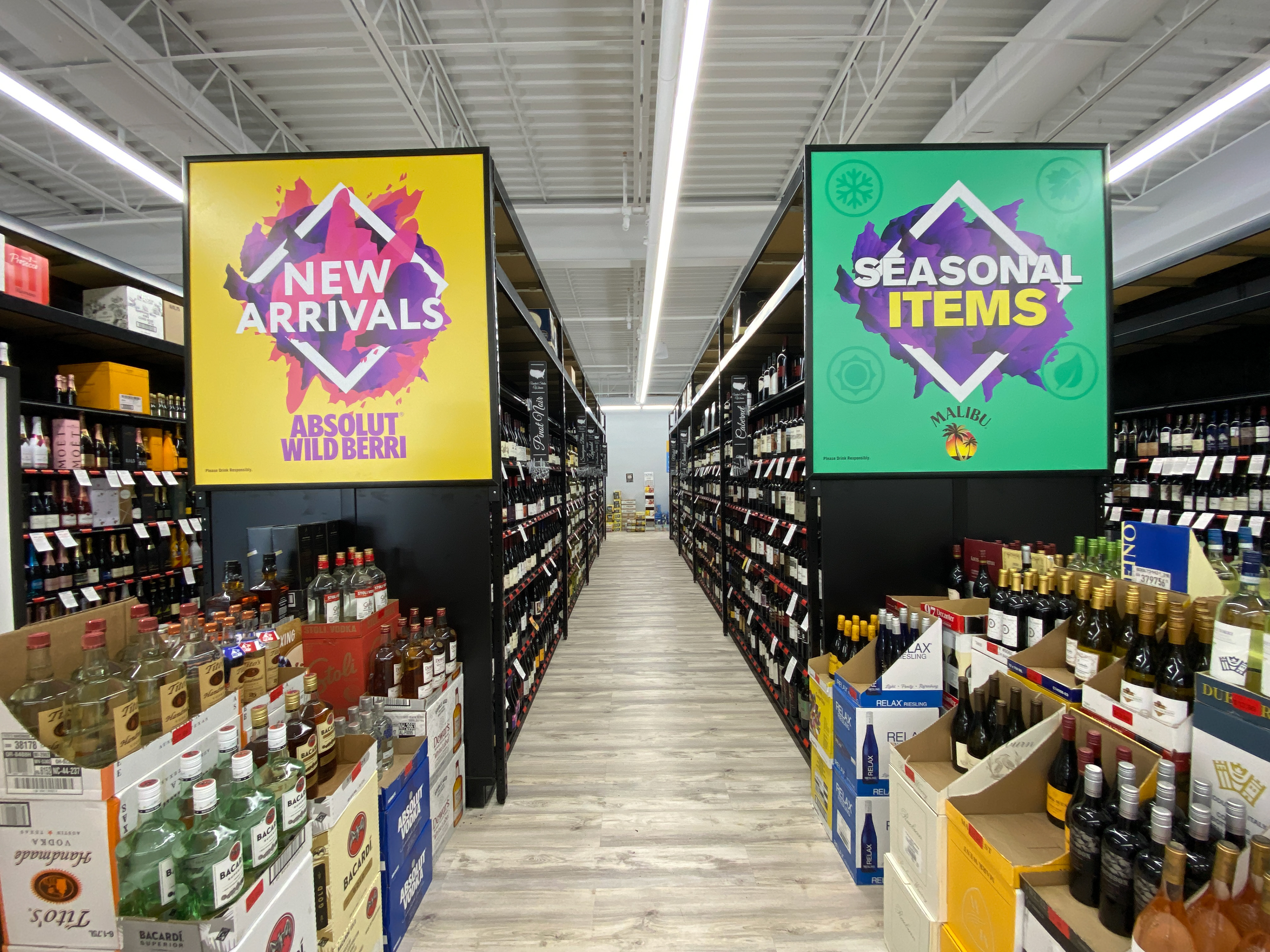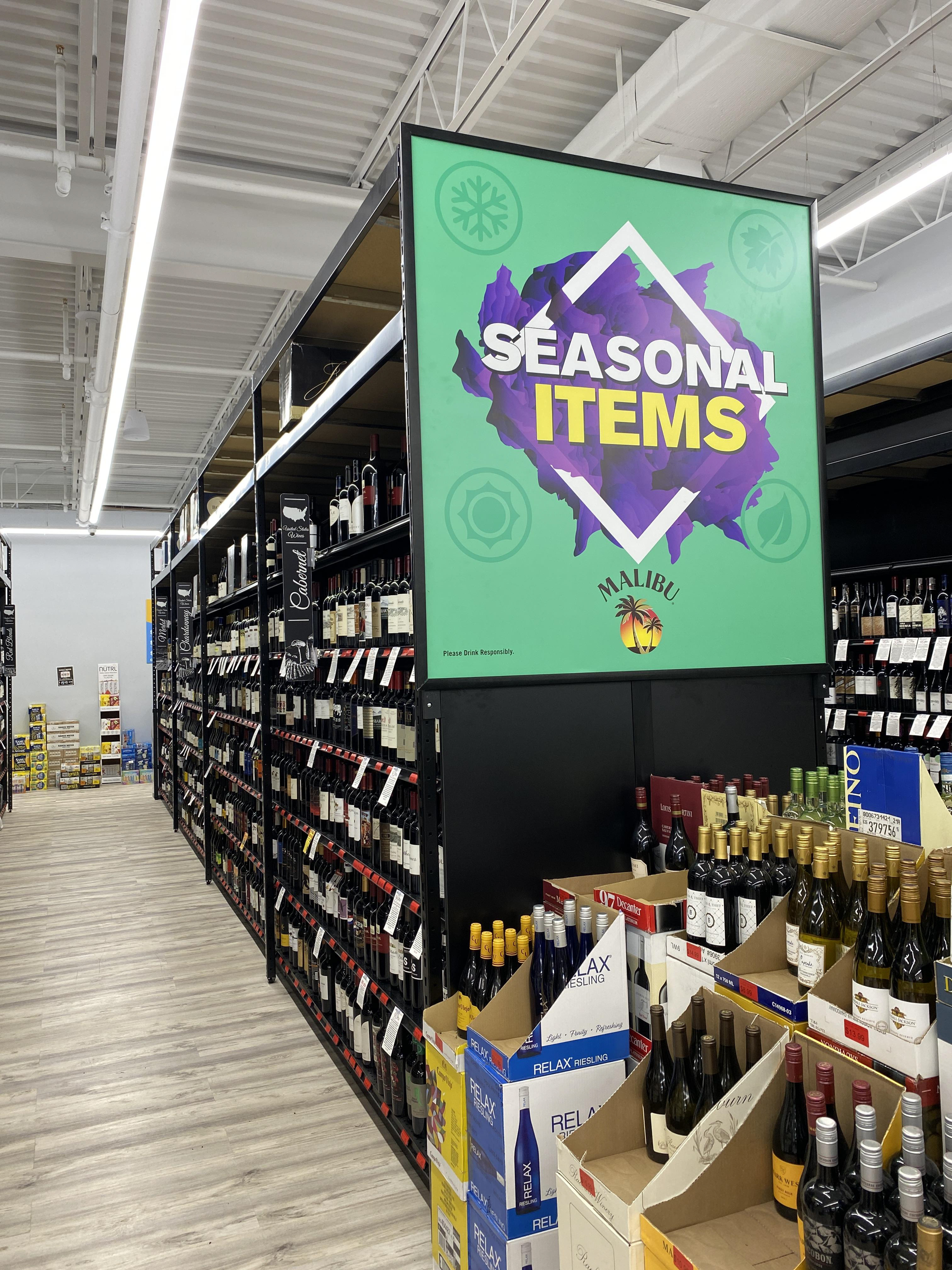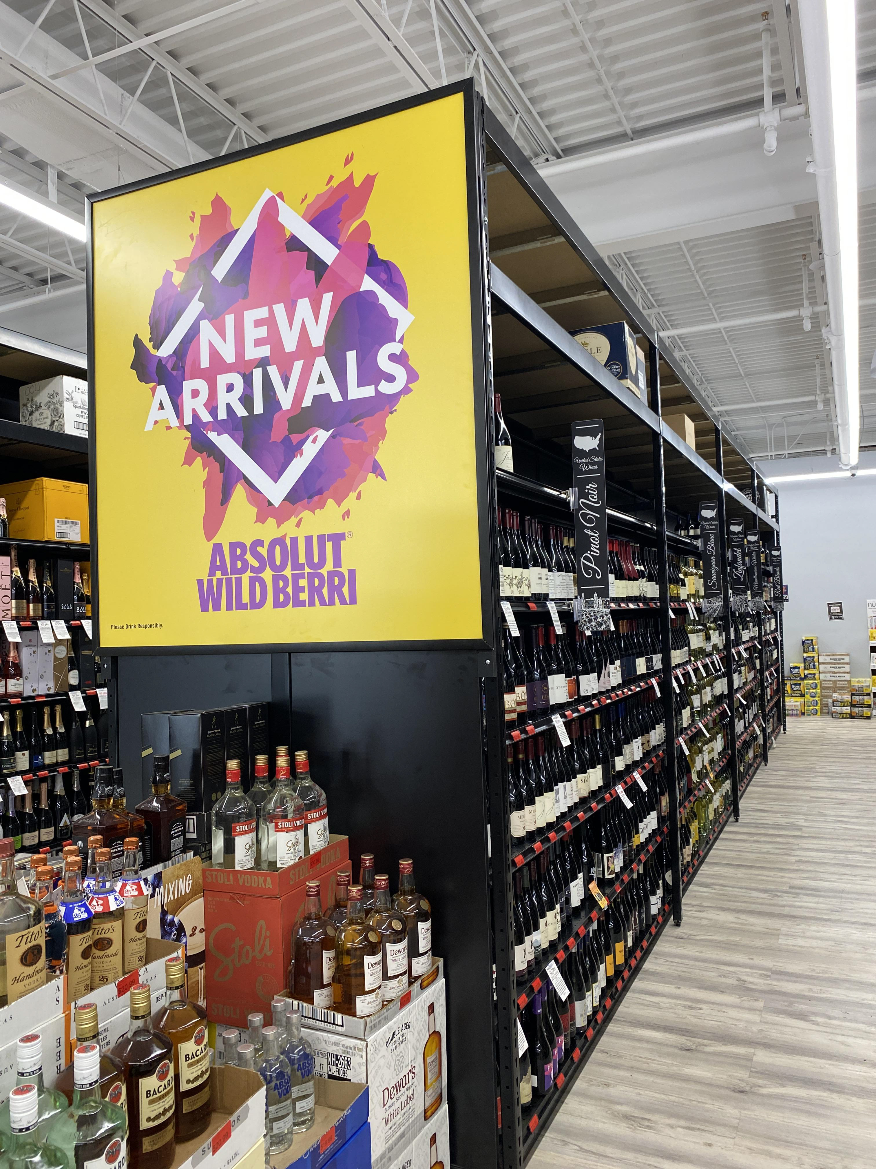 Custom Buildout for Baileys - Wood Frontage on Shelf with Custom Signage & Backer - Case Stacks Go Inside Shelf Area