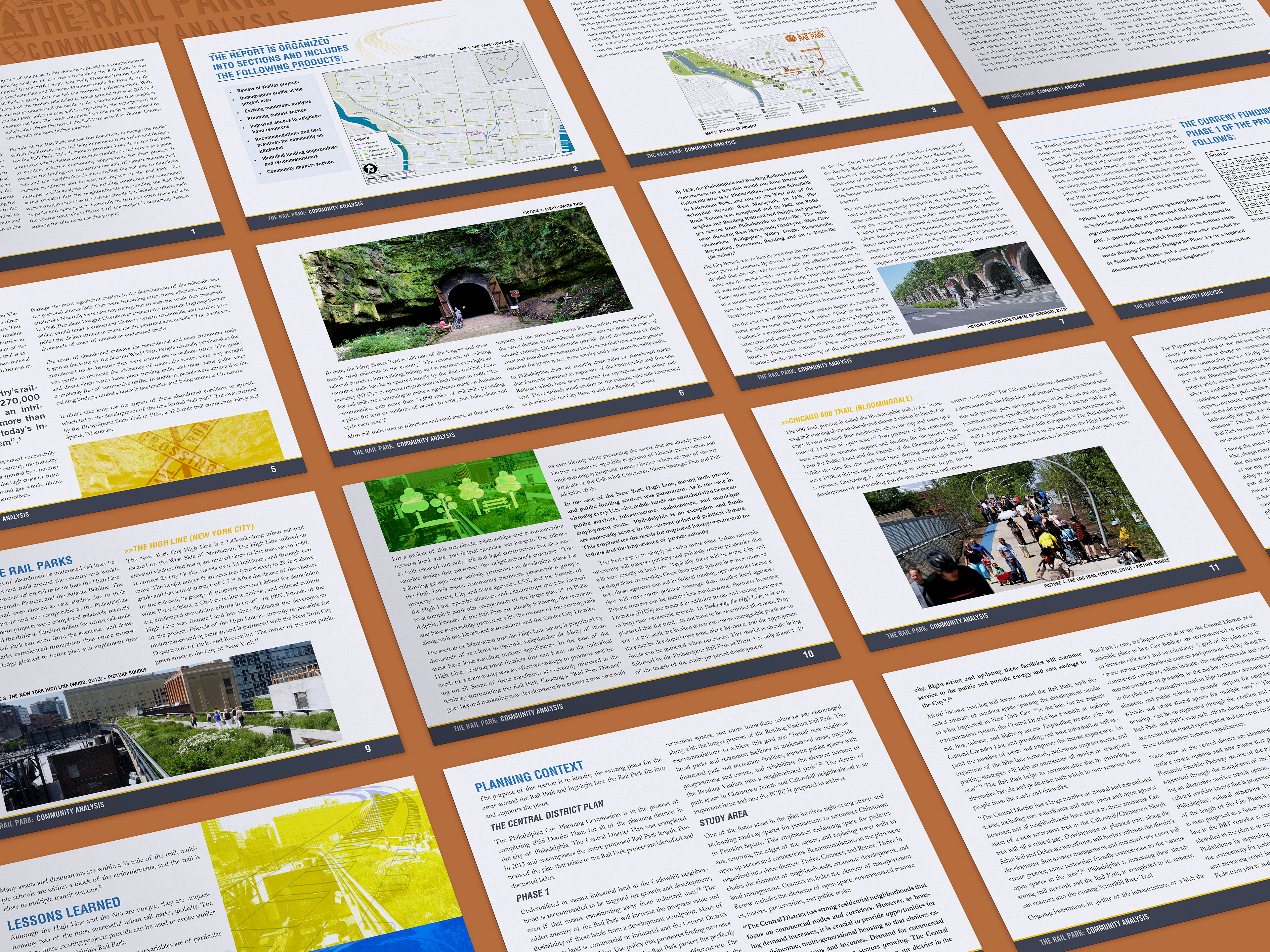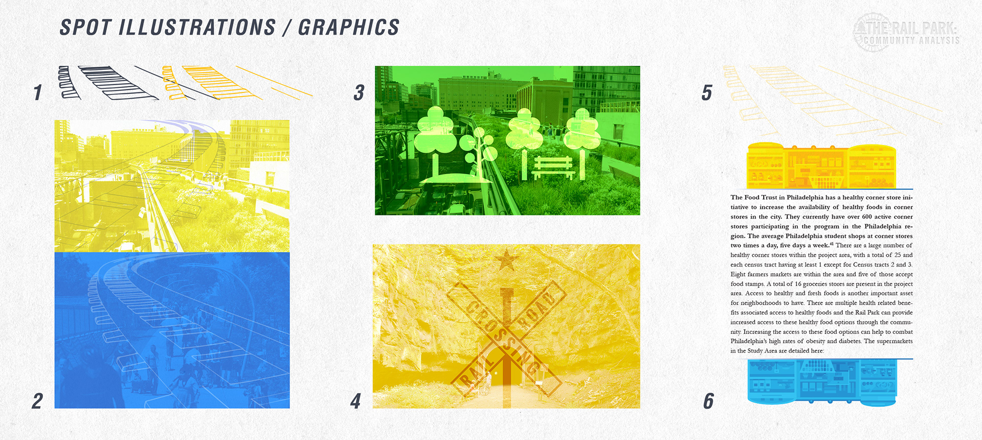 50+ Page Booklet for thesis / capstone research booklet on the elevated Rail Park buildout in Philadelphia. Written content was provided to me by members of the projects, all graphics, logotypes and page artwork were created on my end. Page layouts throughout the book handled on my end as well.