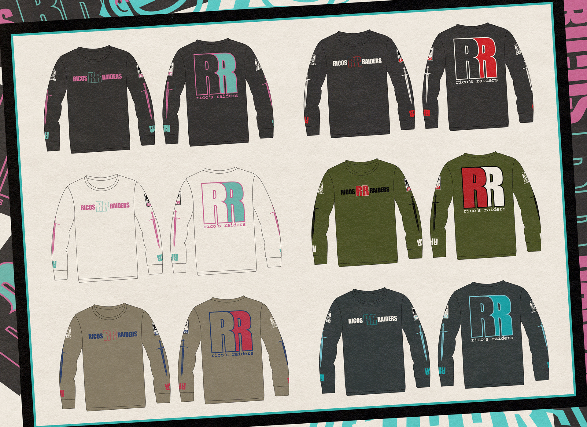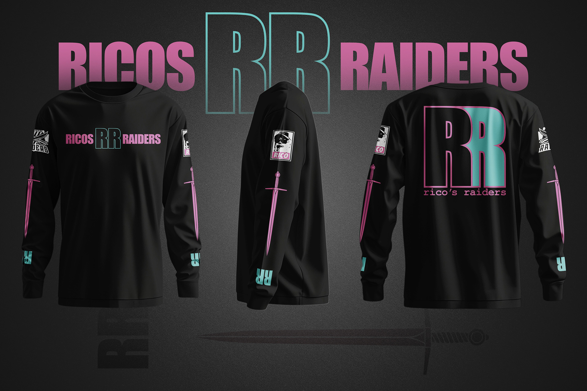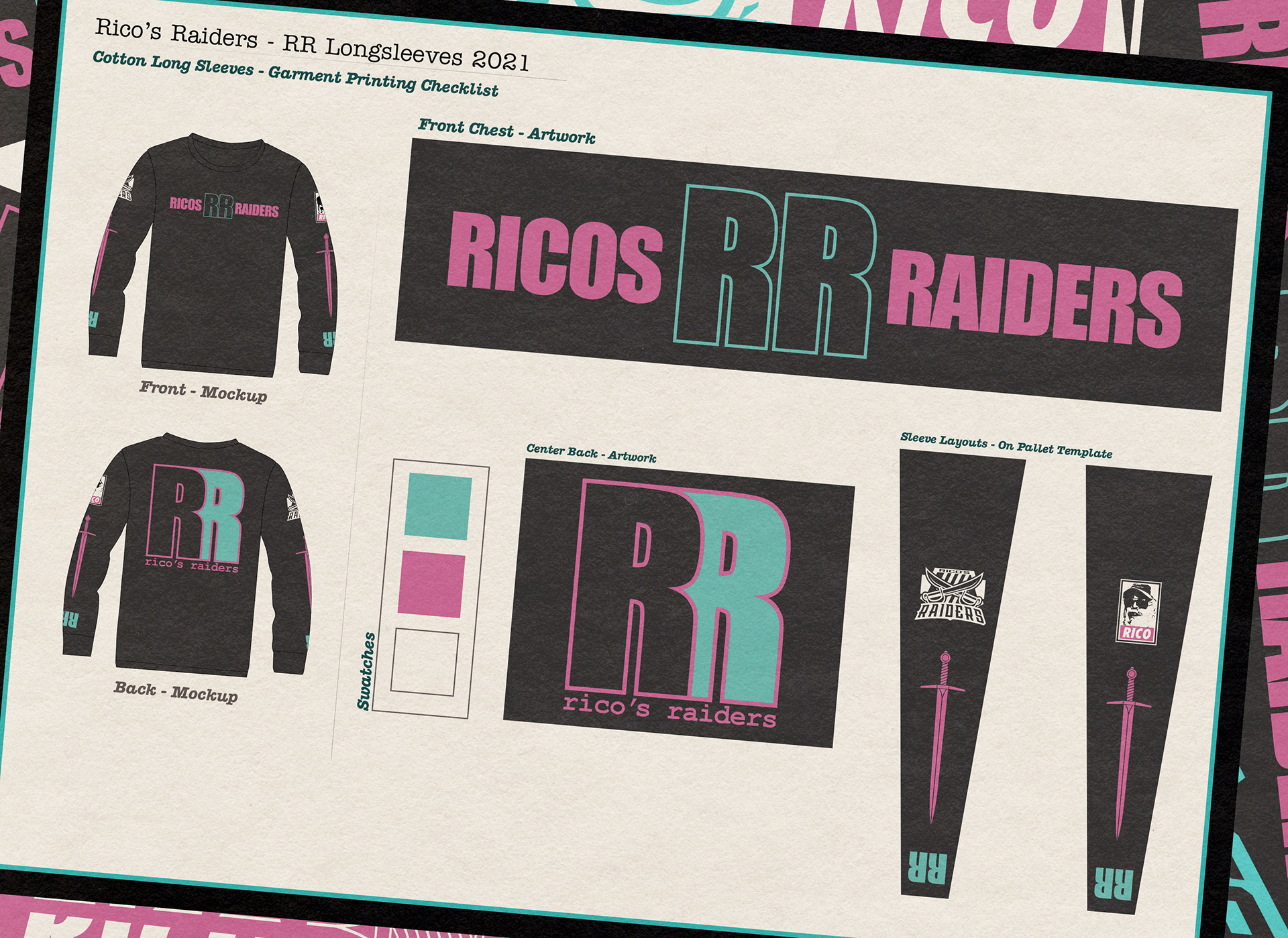 Custom long sleeve practice jerseys for Rico's Raiders paintball team. These were designed to be jerseys thrown on for cold weather practices, also made available for sale to general public as a collectible garment. I handled all aspects of the design, along with prepping the production artwork for screenprinter. Production of job and delivery of all units were handled on my end from start of project to finish.